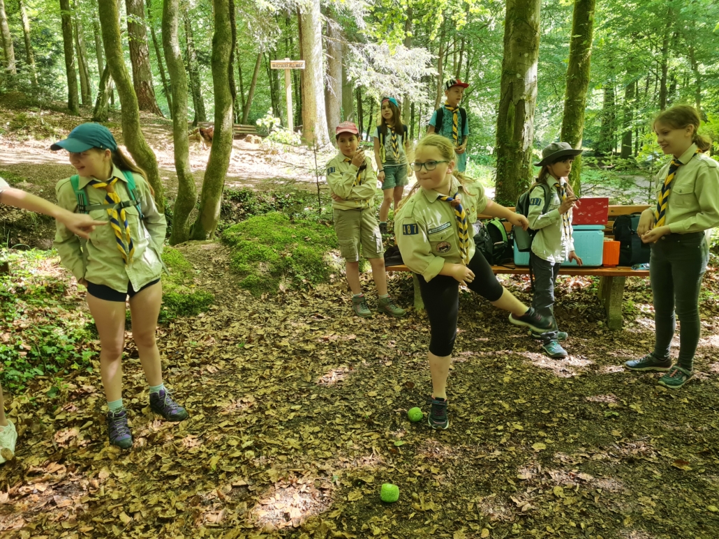 Dort konnten wir mit Laufzetteln eine vorbereitete Strecke ablaufen, auf der wir verschiedene Stationen fanden. Eine Mohrenkopfschleuder, ein Sortier- und Fühlspiel, ein Spinnennetz – das man als Team durchqueren muss, ein gepimptes Dosenwerfen mit Wasserspritzpistolen und für alle mutigen – eine Slackline – auf der man sich austoben konnte. Zum Schluss konnten alle Teams die lange Kugelwaldbahn ausprobieren. Anschließend trafen sich alle wieder auf einem Grillplatz, wo ein gemeinsames Mittagessen auf die Kundschafter und Leiter wartete. Nun hieß es toben, spielen, das Wetter und die Gemeinschaft genießen. Zum Schluss gab es noch eine Andacht und die Siegerehrung des Stationen Laufs.