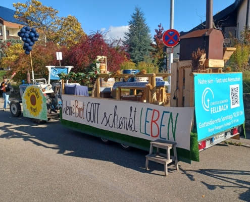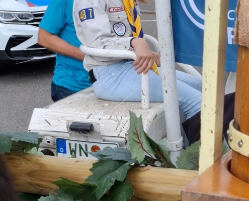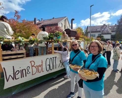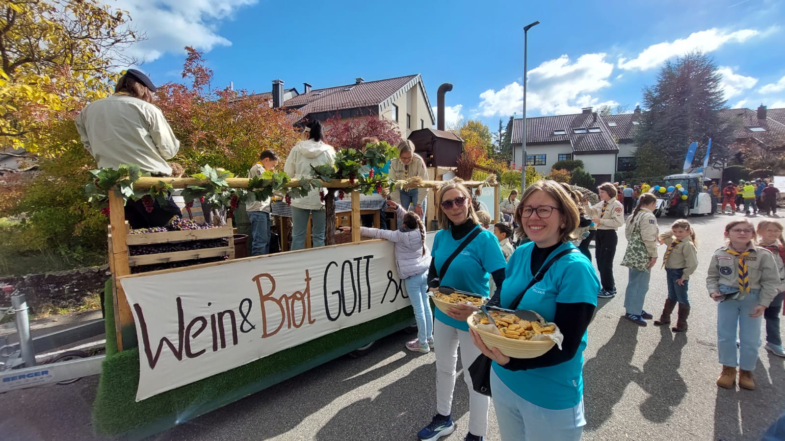 Unsere Pfadfindergruppe hatte zusammen mit der Gemeinde einen Wagen, passend zum Motto, gestaltet: Wir haben live Traubensaft gepresst und stellten mit einer Mühle & Holzbackofen das Brotbacken aus Getreide dar. Die Zuschauer empfingen uns mit Applaus und freuten sich sehr über den ausgeteilten Saft und das selbstgemachte Gebäck.